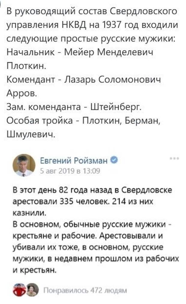 «В этот день 82 года назад в Свердловске арестовали 335 человек. 214 из них казнили. В основном, обычные русские мужики — крестьяне и рабочие. Арестовывали и убивали их тоже, в основном, русские мужики, в недавнем прошлом из рабочих и крестьян», — написал он в Twitter.Однако, неувязочка вышла. По поводу «русских мужиков».